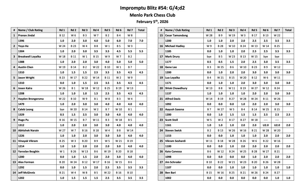 Our first meeting of 2026 was a success with 24 players partaking of seven rounds of G/5+0 blitz action, including many first-time visitors to the club. A hearty welcome to Scott Stoll, Billy and Ketch Allen, Tushar Janefalkar and Nicholas Zhu and thank you again for joining us at the club!