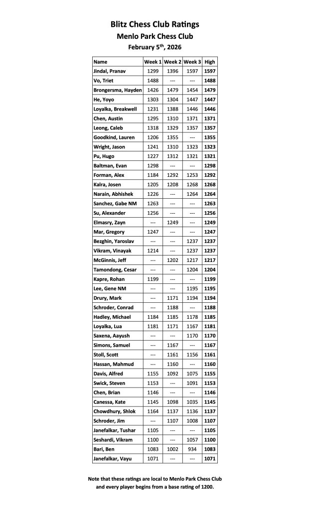 Please let me know if you have any questions about the club championship or about club events for the remainder of the year (https://menloparkchess.club/events/) and I hope to see you at the Arrillaga Center soon! Regards,