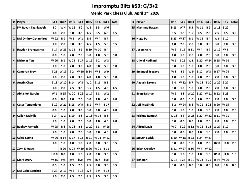 This past Thursday saw both an excellent lecture from Frisco Del Rosario as well as another strong showing for our free, unrated blitz tournament series, with four first-time visitors and three masters participating. After seven rounds of G/3+2 chess FIDE Master and former World Youth Under-12 Co-Champion Rayan Taghizadeh stood alone in first with 6.5 points, his lone draw ceded to our second place finisher at 5.5, NM Dmitry Dzhanhirov. Club stalwarts Hayden Brongersma, Nicholas Tan and Cameron Troy tied for third at 5.0 while Austin Chen was alone in sixth at 4.5. Full results are in the attached wall chart and I’ve also included the updated club blitz point totals and club blitz ratings, the eventual purpose of which remains embarrassingly unclear at this time.