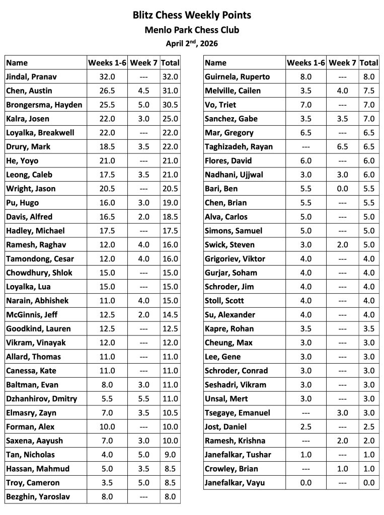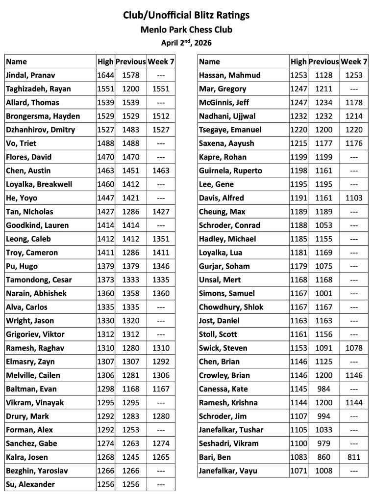 Lastly for now, the club’s Events page (https://menloparkchess.club/events/) has been updated through the beginning of May and, to summarize, we’ll have two more weeks of casual blitz events followed by Chess960 Draft on April 23rd and an A4c Variant tournament on the 30th, then I hope to begin our next rated event May 7th — more details about that will be shared soon. Regards,