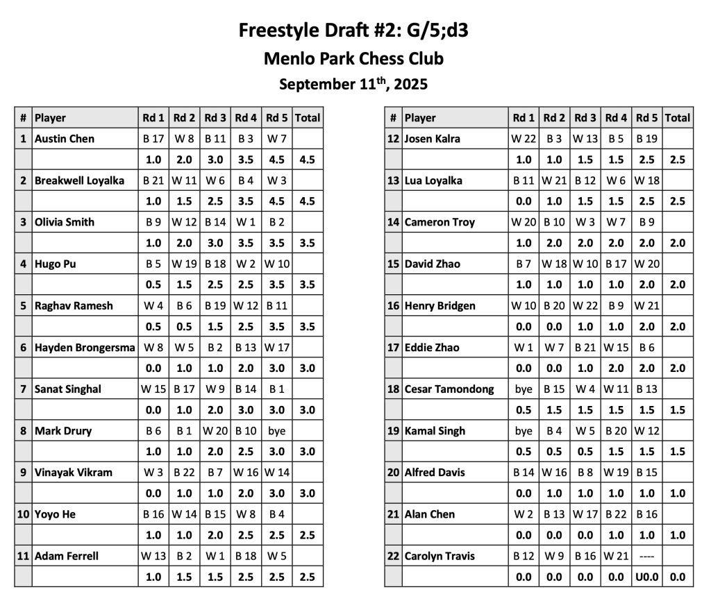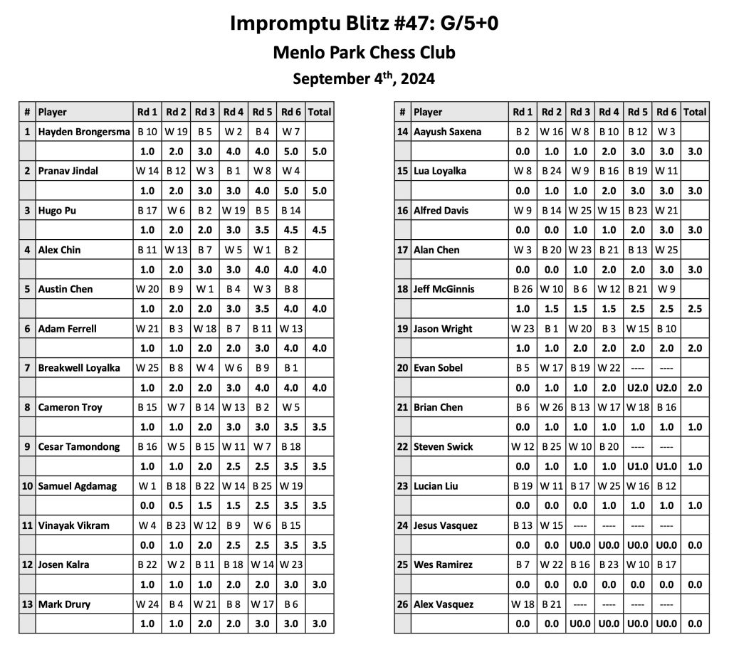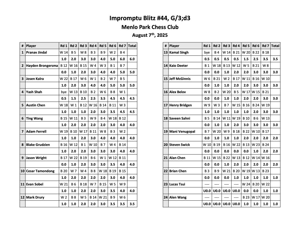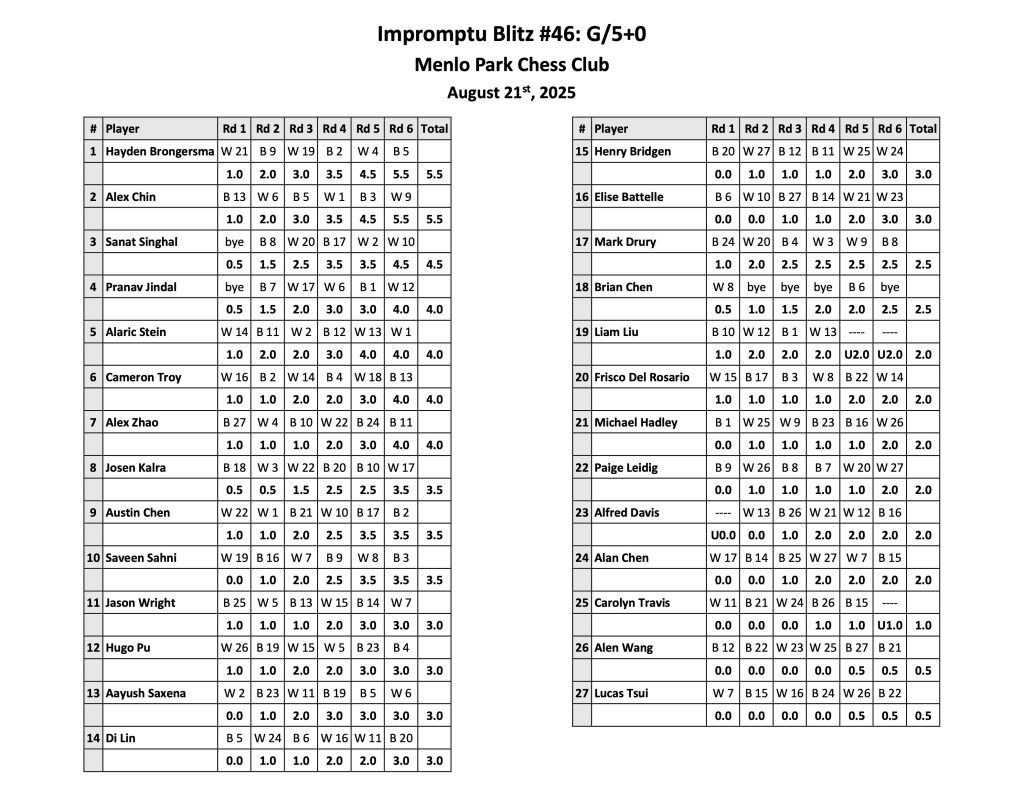 Please let me know if you have any questions about the club championship or about club events for the remainder of the year (https://menloparkchess.club/events/) and I hope to see you at the Arrillaga Center soon! Regards,