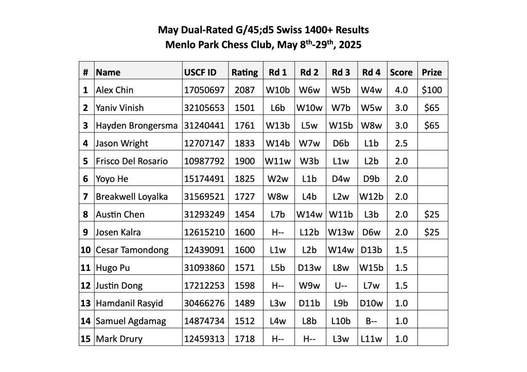 Below are the final results and prize distributions for our May Dual-Rated Swiss event. Congratulations to Alex Chin for his first place win and perfect score in the 1400+ section, to Hayden Brongersma and Yaniv Vinish for shared second and to Austin Chen and Josen Kalra for splitting the 1600-and-under prize. In the U1400 section, Di Lin and Neeraj Rao shared first place followed by David Tagatac and Cameron Troy in a tie for third. Note that Cameron claimed the U1200 prize in that section, leaving David with the $60 third prize (the U1400 section had two more paid entries than did the 1400+, hence the slightly larger prize fund).