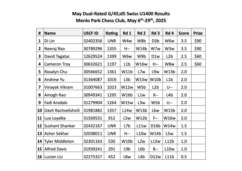 The tournament was rated by US Chess earlier this week and the results are available here: https://www.uschess.org/msa/XtblMain.php?202505299942.0-12459313 (full cross tables for both sections are in the attached images).